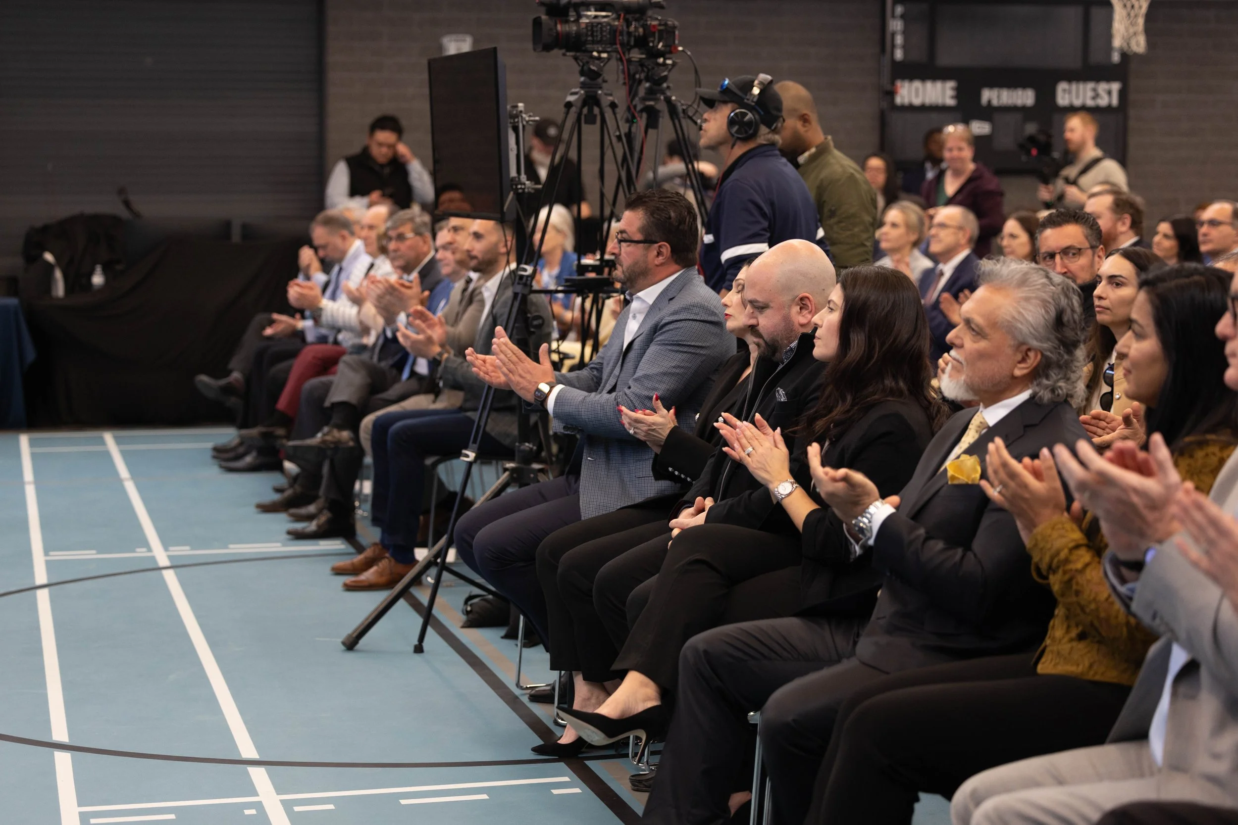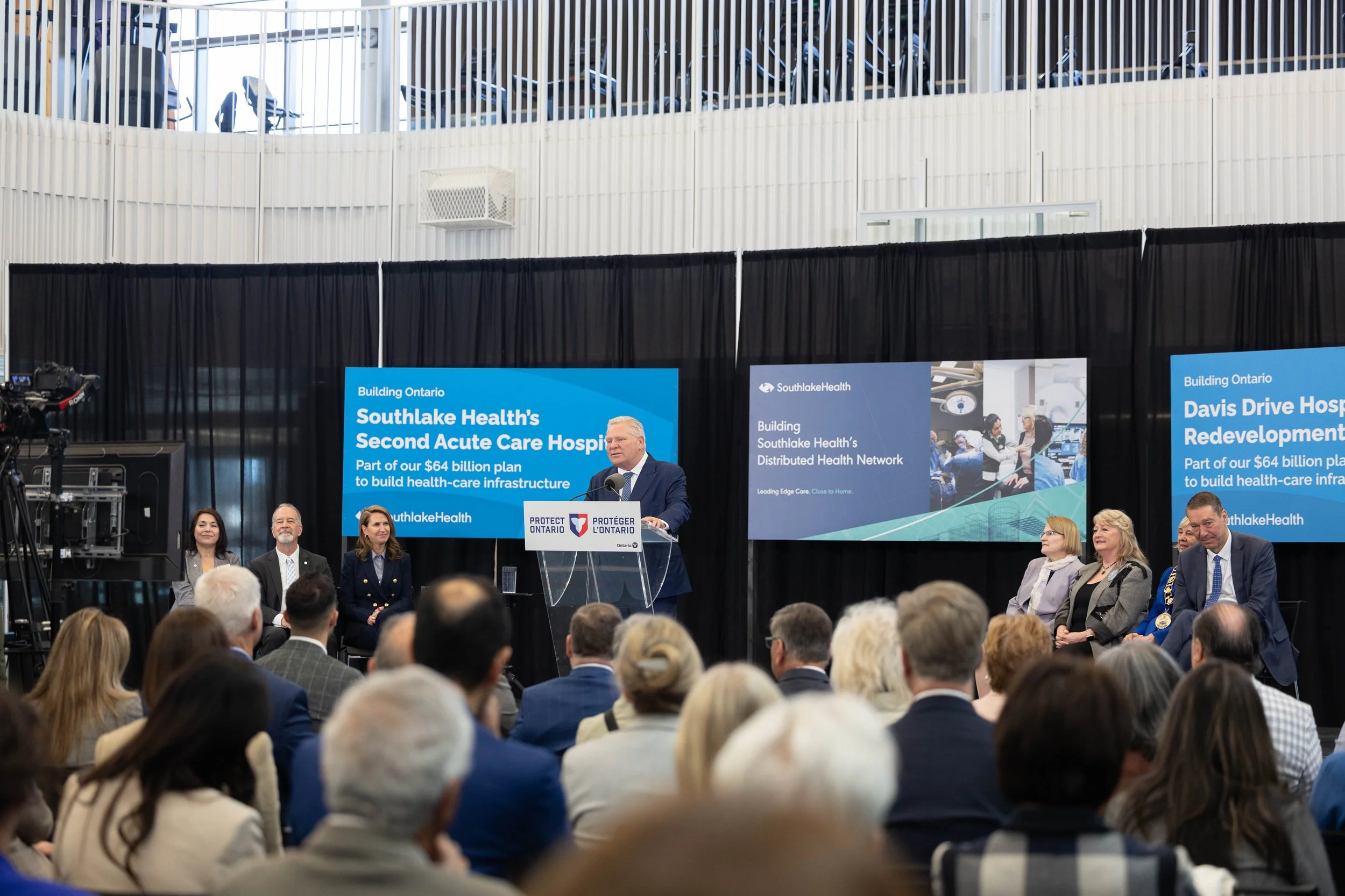 Speaking from the podium were Doug Ford, Premier of Ontario; Sylvia Jones, Deputy Premier and Minister of Health; Caroline Mulroney, Minister; and Dawn Gallagher Murphy, Member of Provincial Parliament for Newmarket–Aurora, along with John Taylor, Mayor of Newmarket; Virginia Hackson, Mayor of East Gwillimbury; Dr. Paul Woods, President and CEO of Southlake Health; and Jennifer Ritter, President and CEO of the Southlake Health Foundation—along with dozens of leaders in healthcare, donors, and elected officials.
